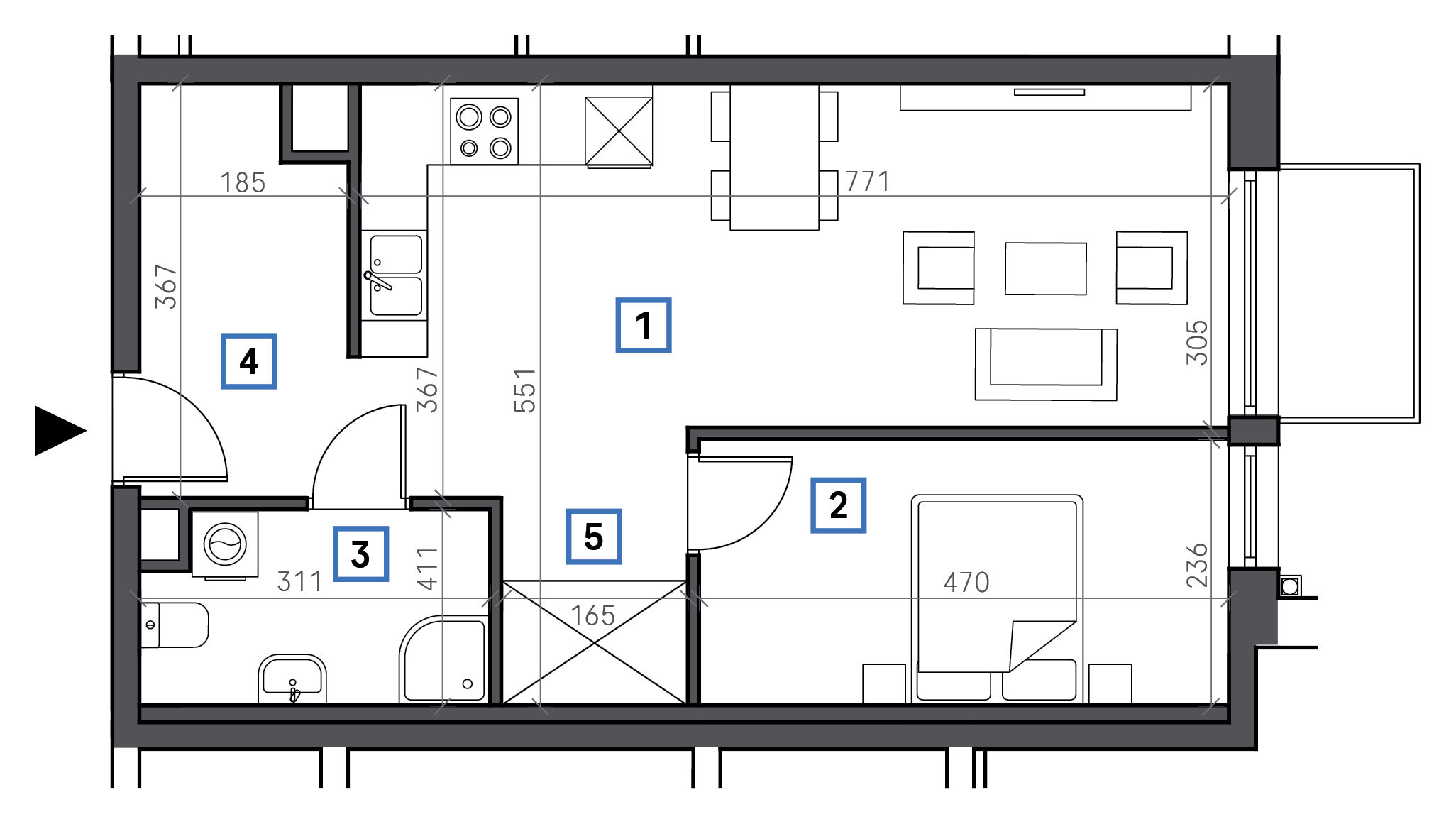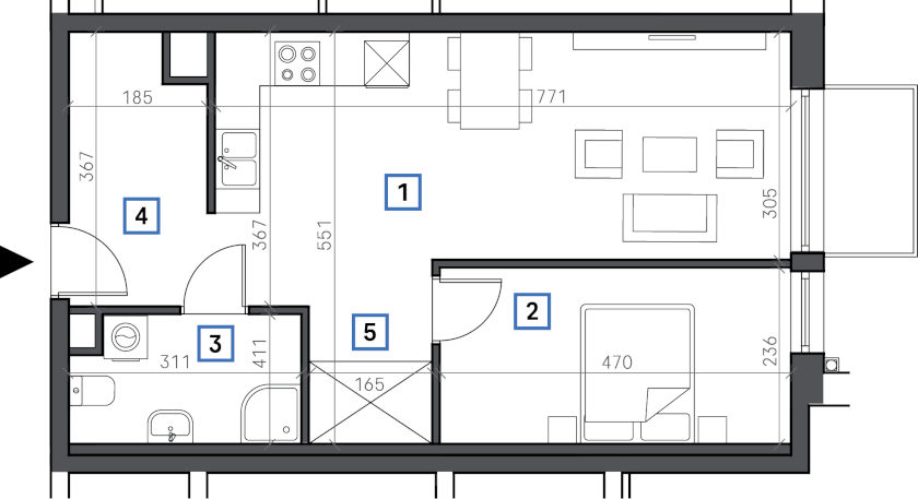 1. Pokój + aneks kuchenny 23,70 m2