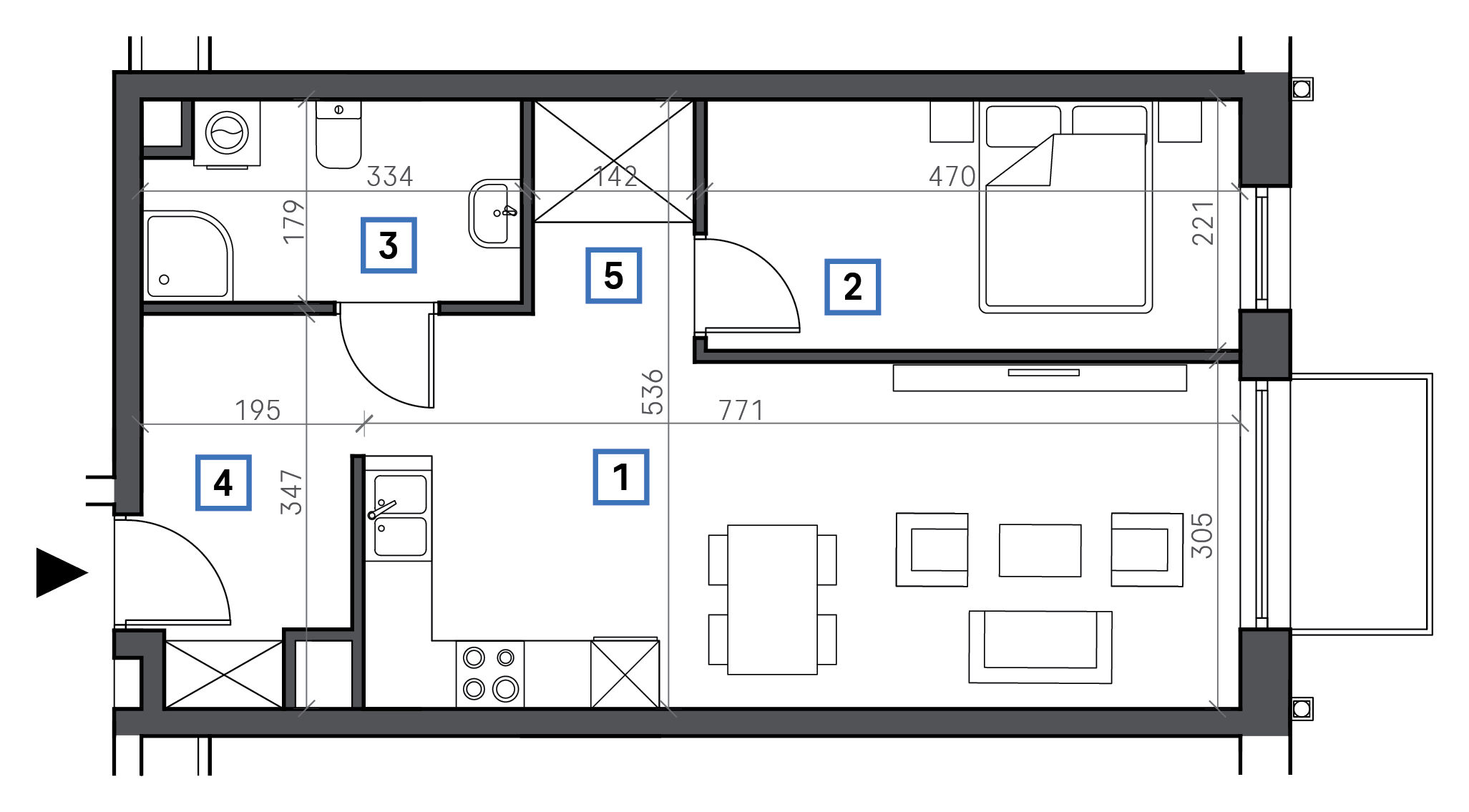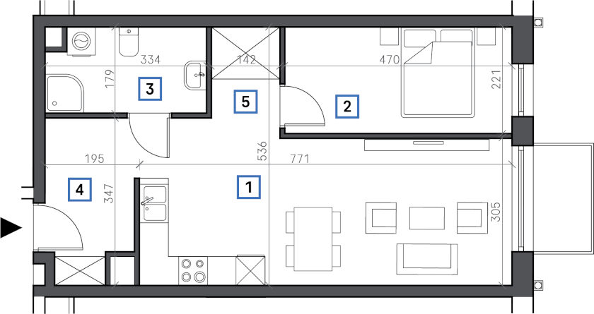 1. Pokój + aneks kuchenny 22,53 m2