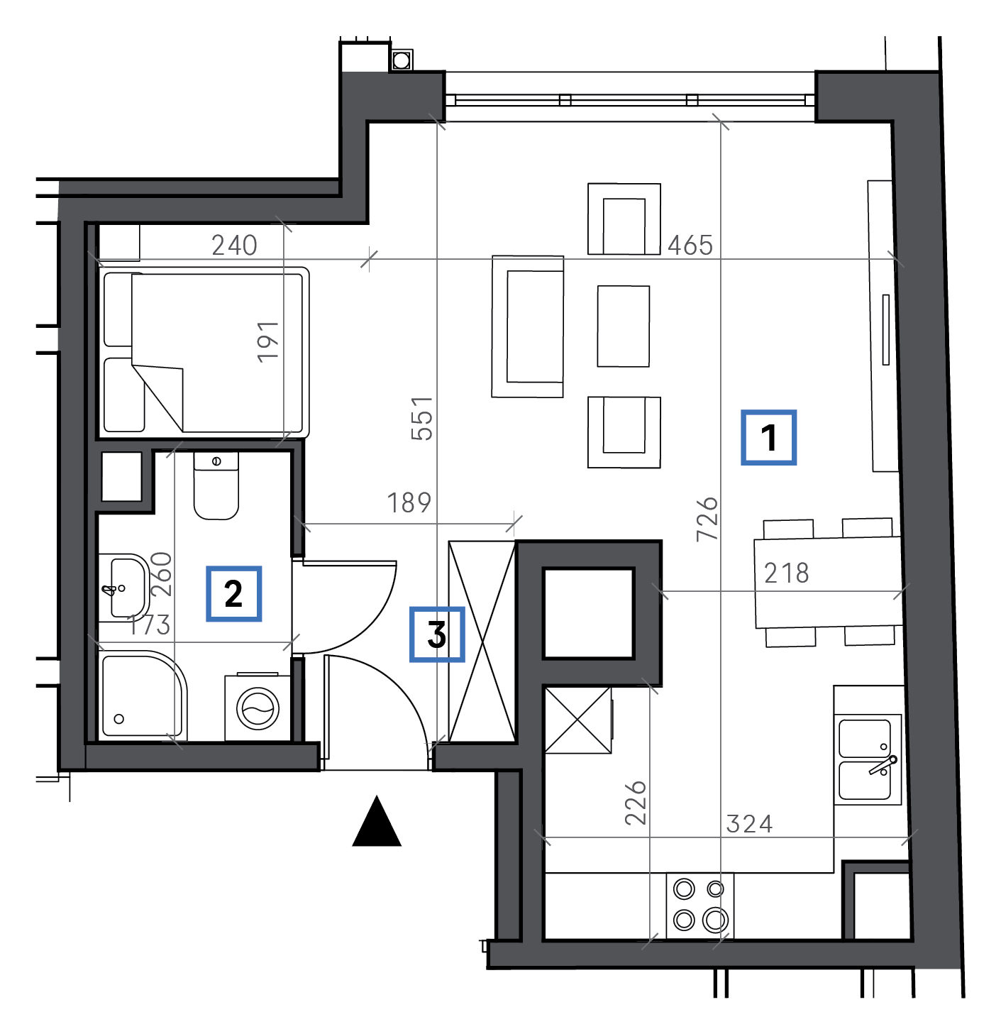 Wielkość pomieszczeń i całkowita powierzchnia lokalu może ulec zmianie, nie uwzględnia powierzchni balkonu.