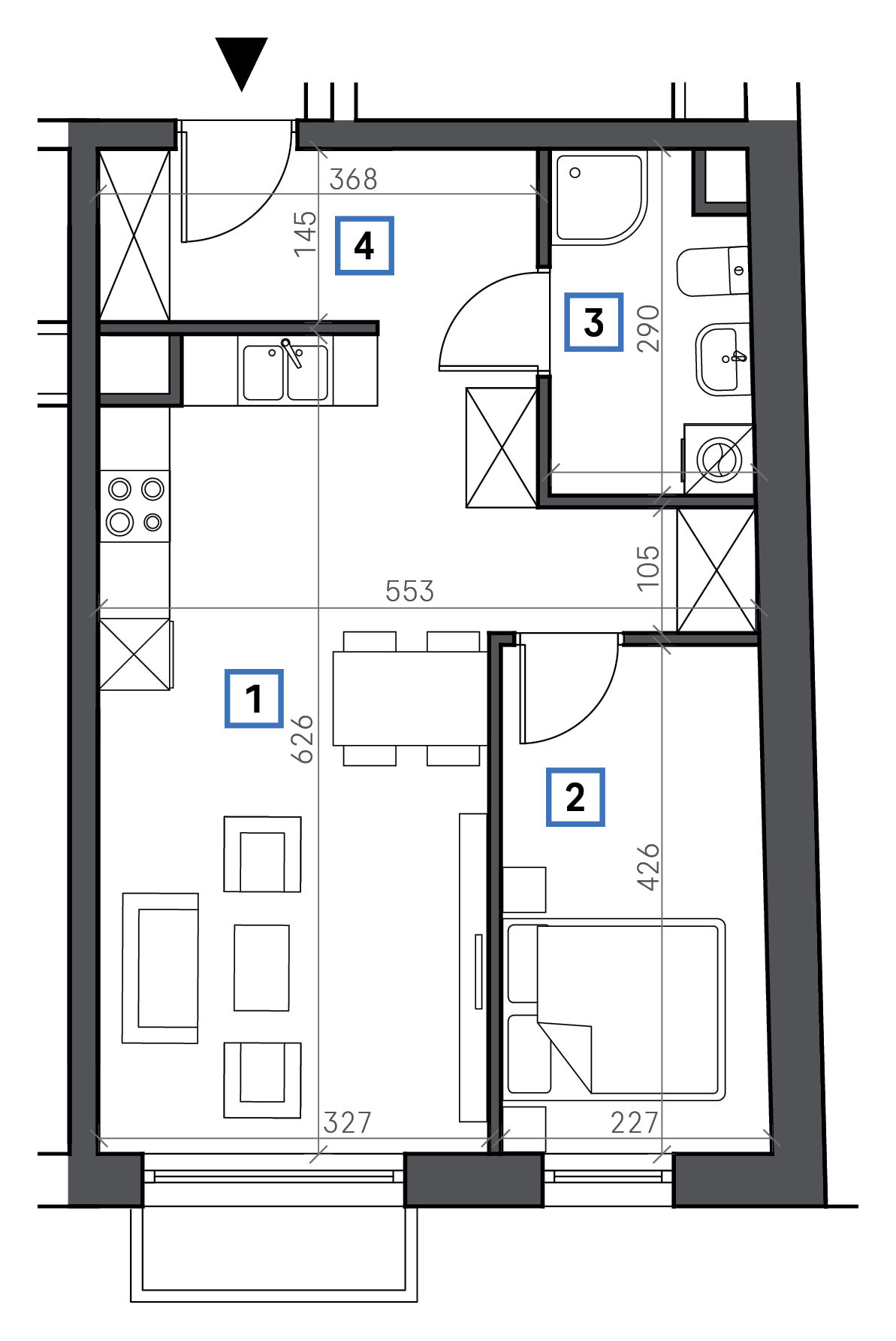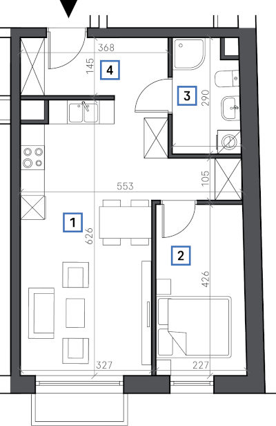 1. Pokój + aneks kuchenny 21,35 m2